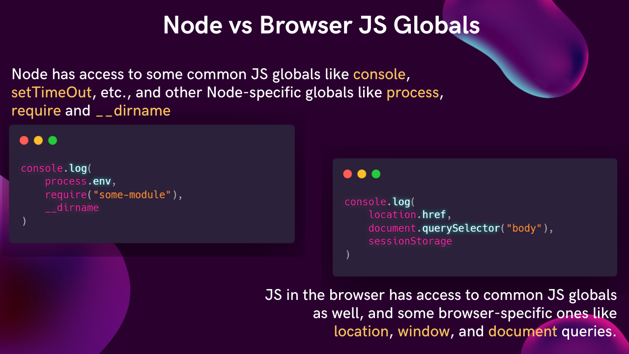 Node has access to some common JS globals like console, setTimeOut, etc., and other Node-specific globals like process, require and __dirname.