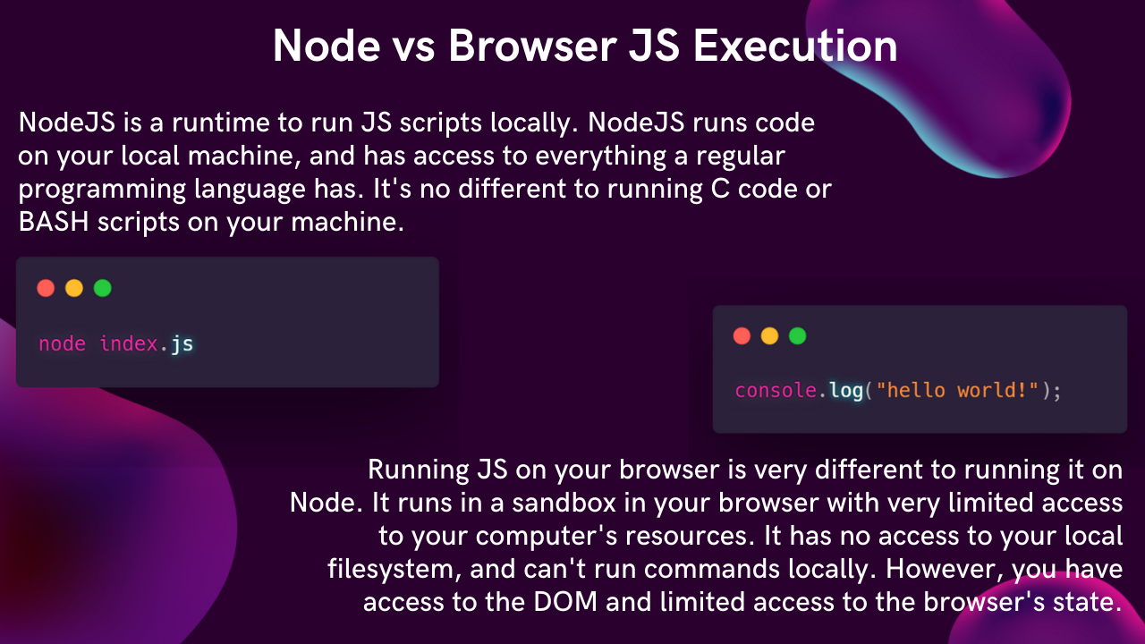 NodeJS is a runtime to run JS scripts locally. NodeJS runs code on your local machine, and has access to everything a regular programming language has. It's no different to running C code or BASH scripts on your machine.