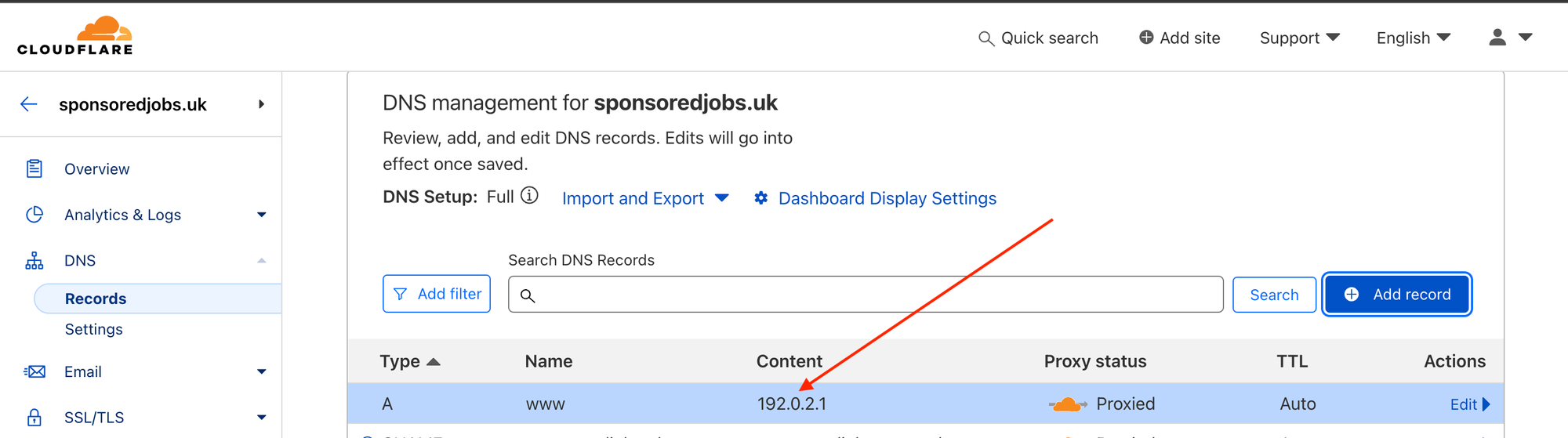 Go to the DNS record settings for your website on Cloudflare by clicking on "DNS Records" on the home page, or clicking on DNS and then Records on the side-menu.