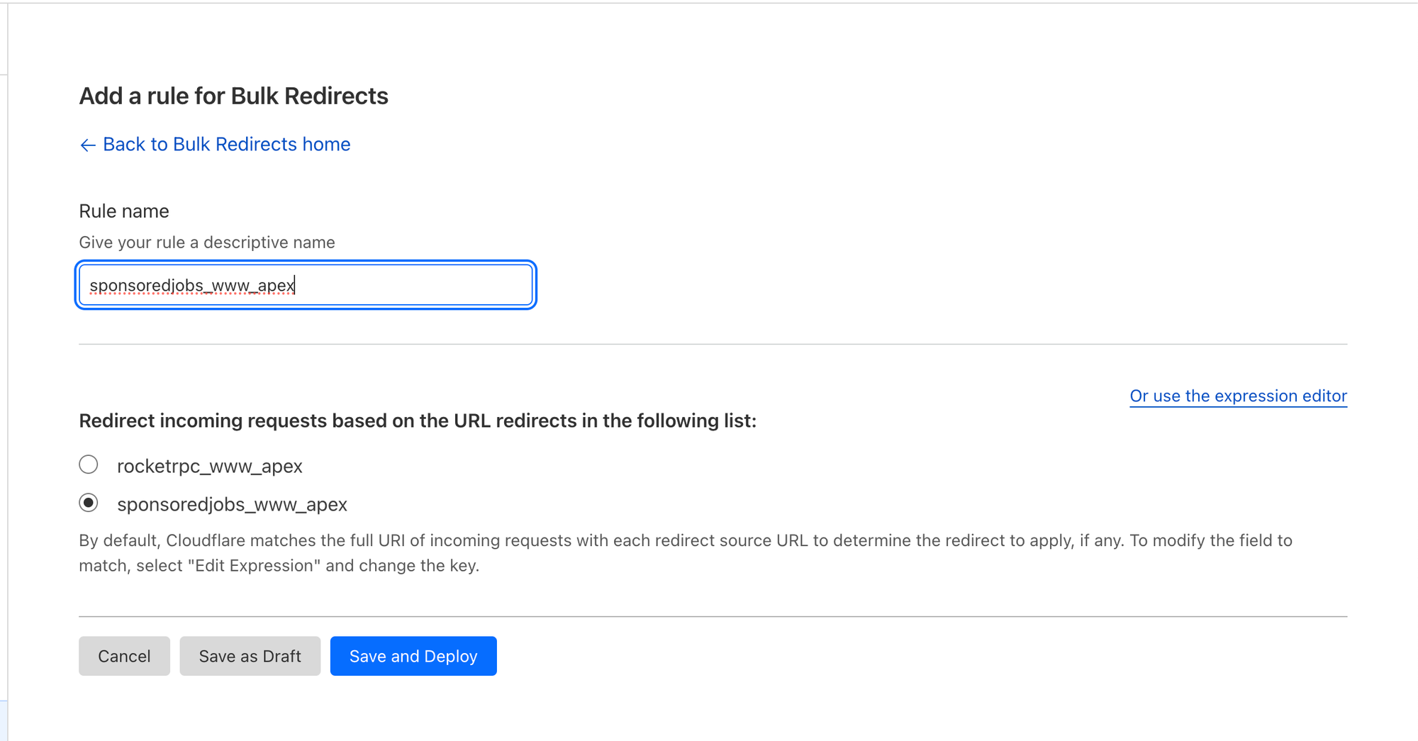 Add a name to your rule, choose the redirects list from the list, and hit "Save and Deploy"