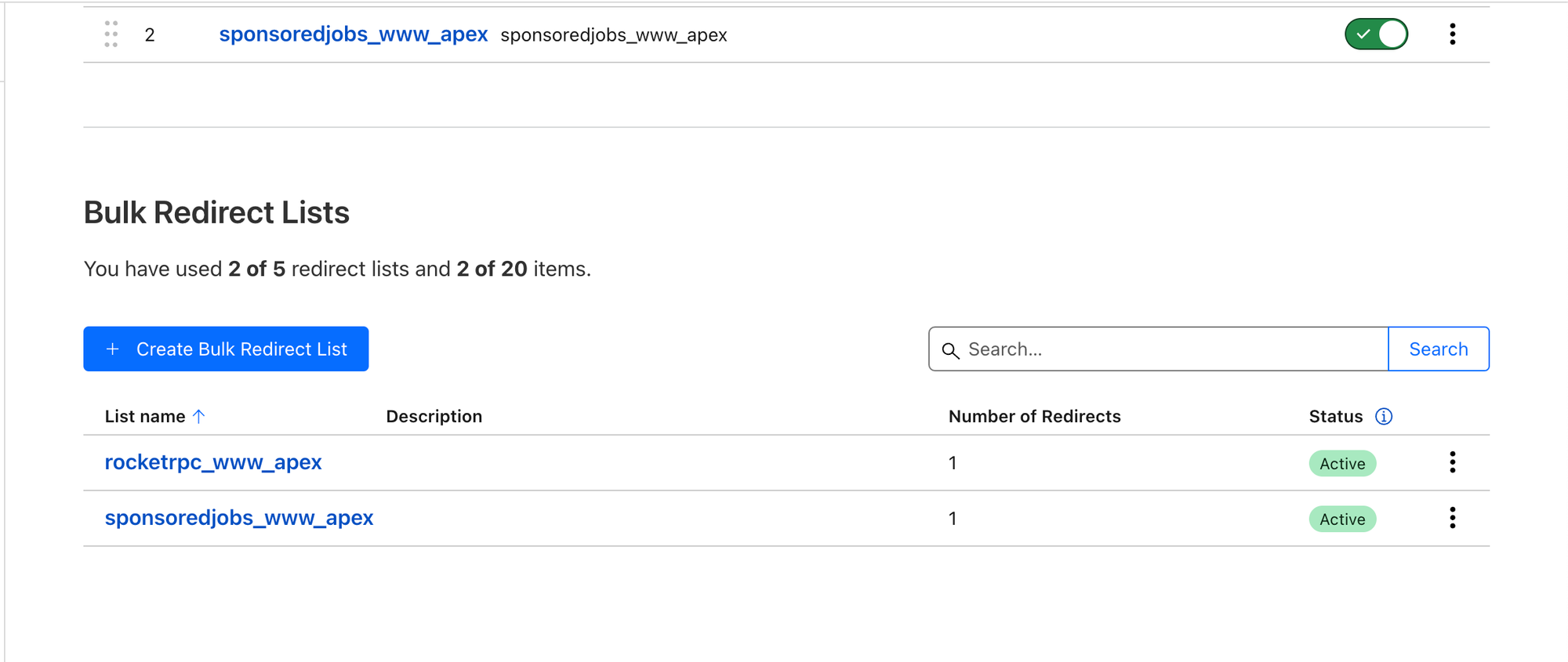Scroll down on this page to see the option to "Create Bulk Redirect List". Click on it to create a new list.